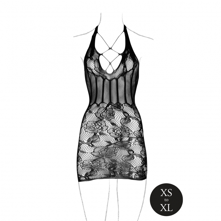 Het sensuele kanten patroon en de gedurfde visnetdetails voegen een extra dosis glamour en sexiness toe aan je uitstraling. Deze jurk laat je schitteren als nooit tevoren. We willen je er echter aan herinneren dat de bijpassende string niet is inbegrepen, zodat je de vrijheid hebt om je eigen lingerie te kiezen en je look aan te passen aan je persoonlijke stijl.